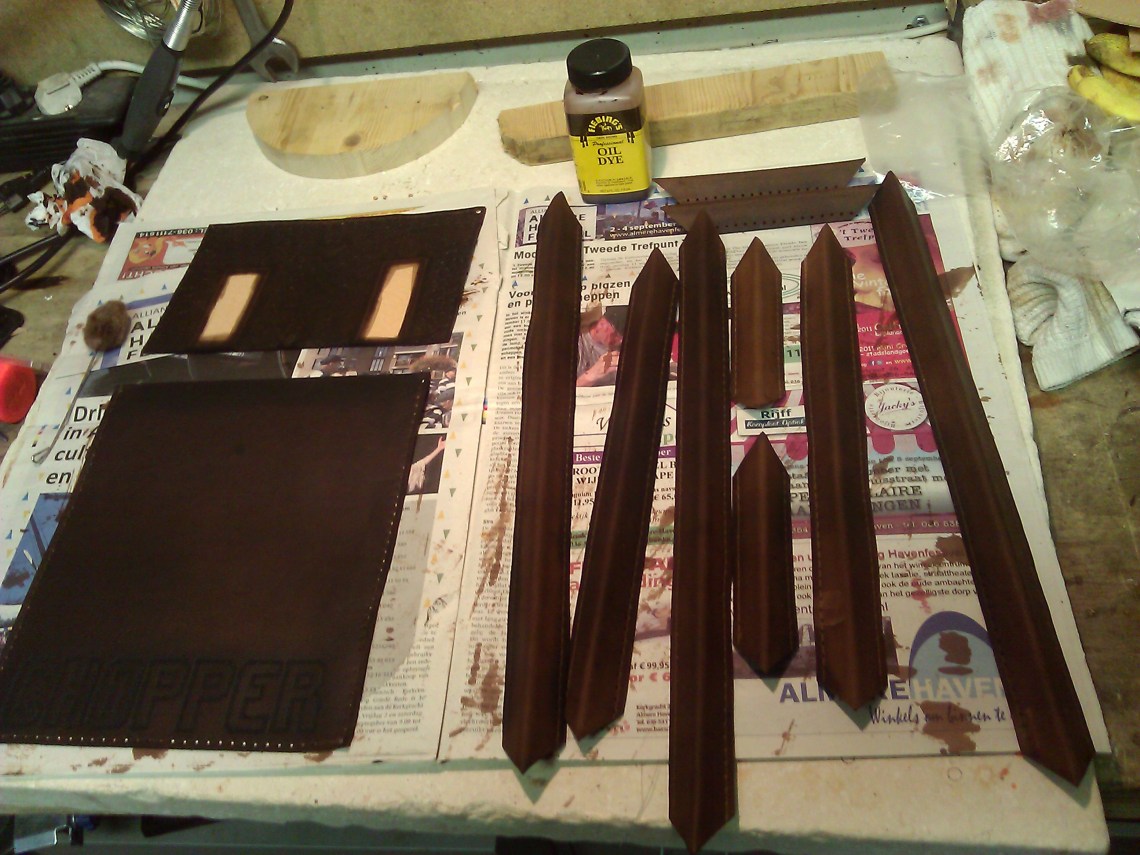 All the corner and front pieces I will paint twice. Once with oil based paint (see picture) and a layer of antique gel (from Tandy Leather Factory) to finish.