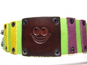 A green leather bracelet with a Smile