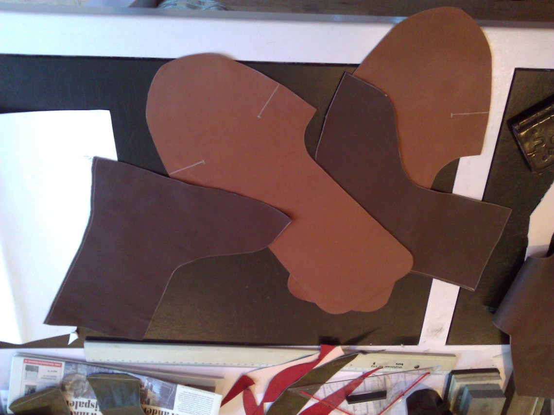 Hieronder kan je de werkzaamheden en resultaten van vandaag zien. Handelingen die al eerder voor de passchoen zijn verricht, maar nu twee voor twee schoenen en apart voor het bovenleer en de voering. Dus veel aftekenen, snijden, schalmen en vooral goed opletten dat van sommige stukken een linker en rechterkant nodig hebt. De kleuren van de schoenen zijn nu ook definitief.