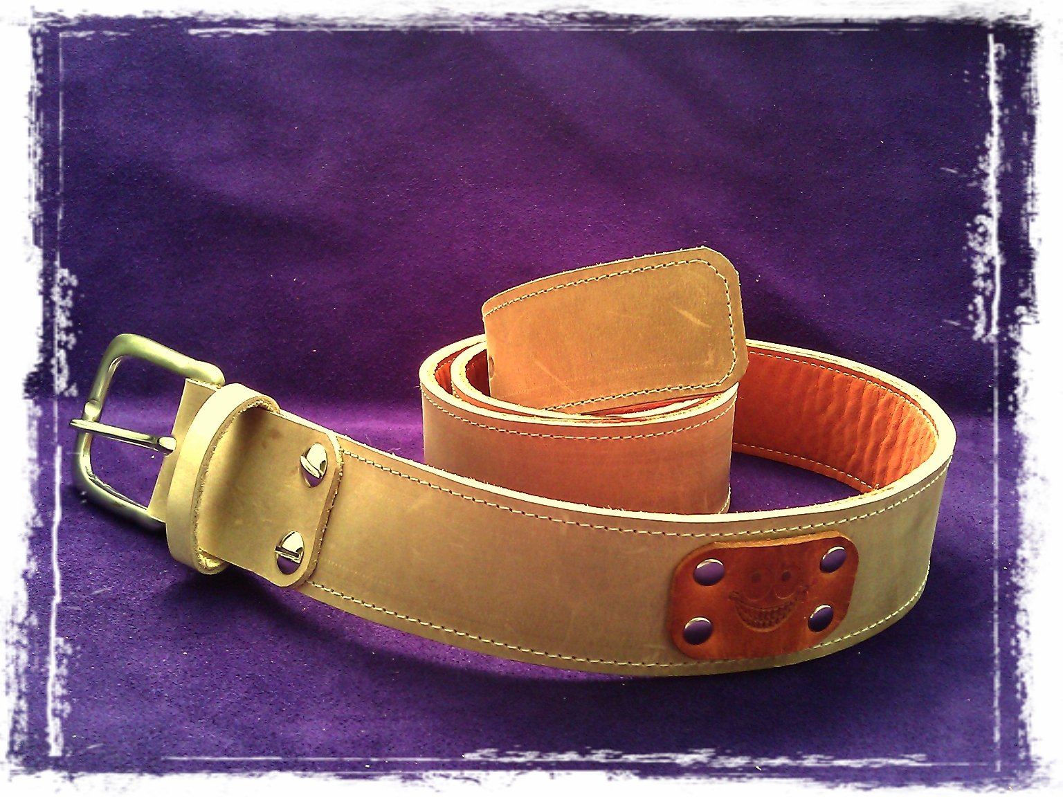 A handmade leather belt made of two straps of quality leather. I used book screws to attach the buckle so you can change the buckle and flip the belt to the other side.