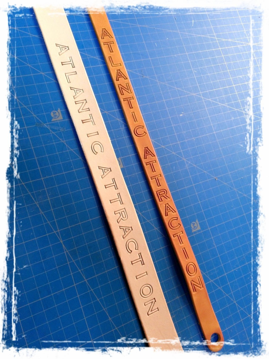 A few steps further in creating the guitar straps. Two straps now have the band name and one has color.