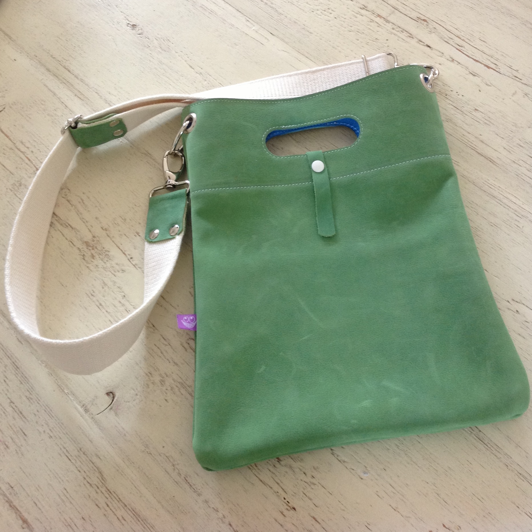 A simple and fun green leather bag. The top of the bag is reinforced with bright blue leather.
