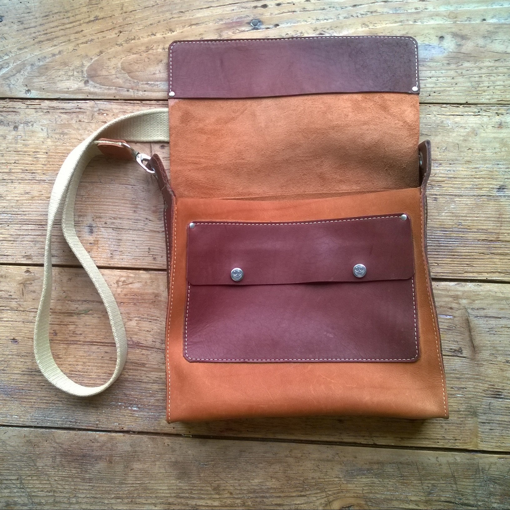 This Brown leather messenger bag is a recent custom order I finished. The bag has a large main compartment with a small one on the inside and on the front.