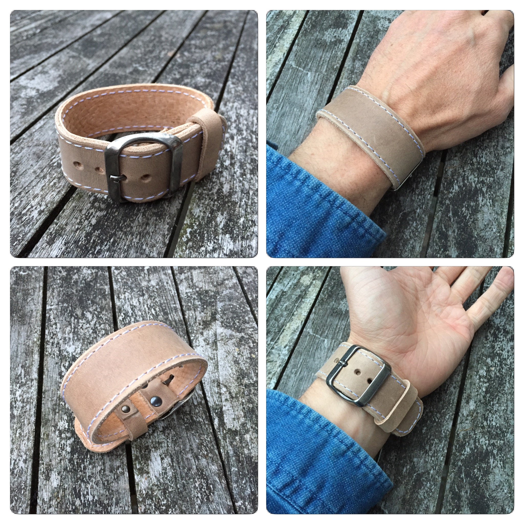 Bracelet made from sand color leather with a raw look and lined with soft thin leather, stitched together with strong white thread.