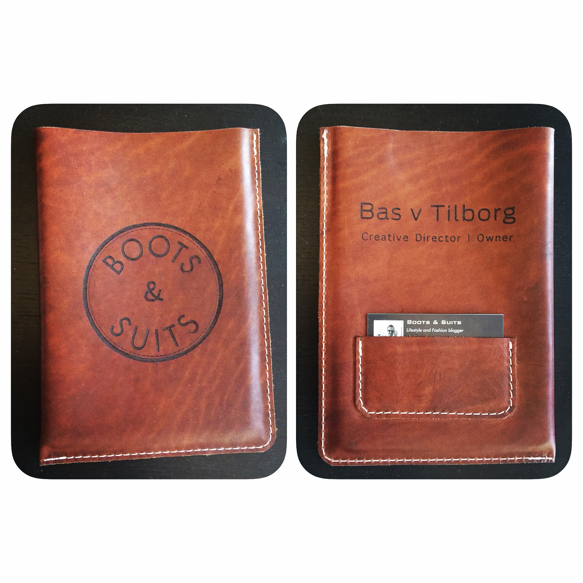 On www.bootsandsuits.nl Bas shares his take on lifestyle, fashion and nice gadgets. After creating a camerastap for him I was happy to see him again for a custom leather sleeve for his iPad mini. The leather sleeve is made of nice raw looking leather with his logo laser engraved into the leather. On the back you see his name and an extra pocket for his business cards.